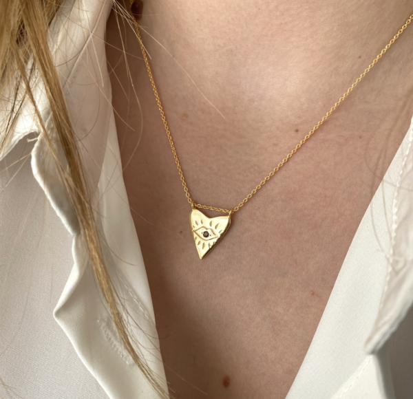 Collier amulette en plaqué or et petite tourmaline semi-précieuse au centre d’un coeur symbole .
