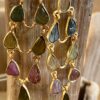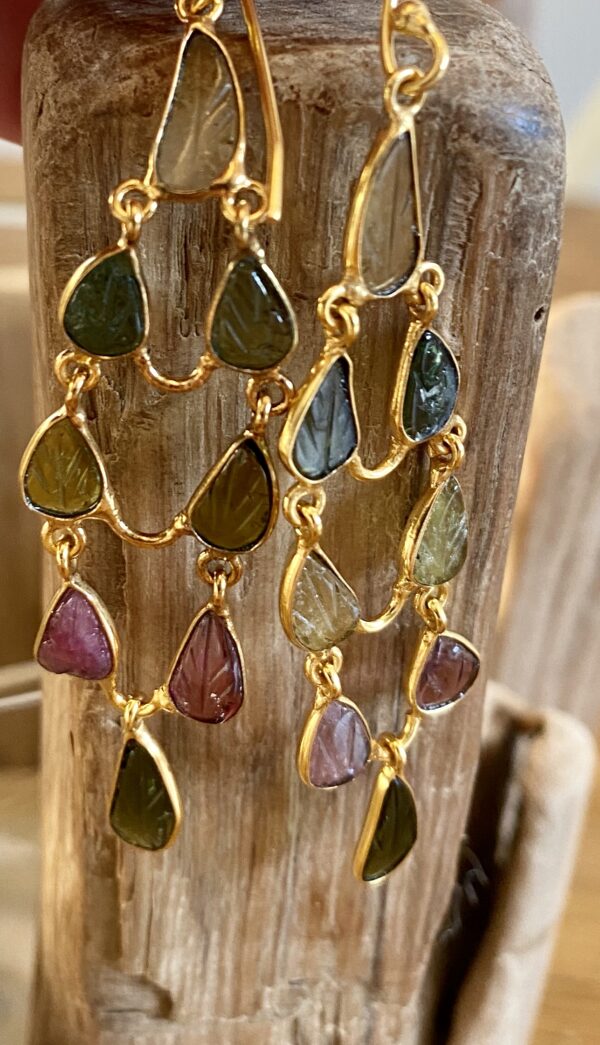 Boucles en plaqué or et pierres semi-précieuses multi Tourmalines gravées et serties. Un esprit chic intemporel un brin bohème comme on aime.
