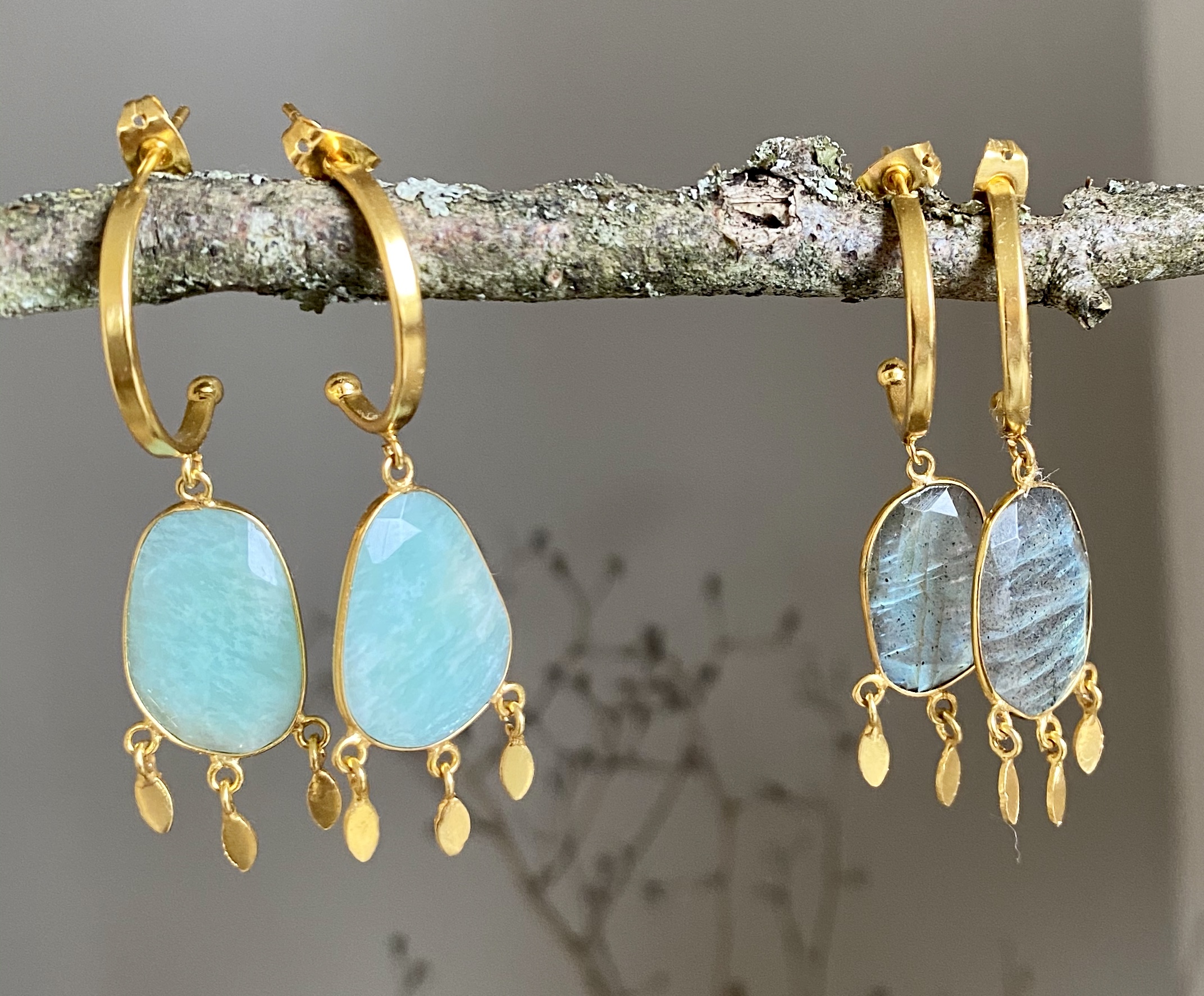 Boucles en plaqué or et pierre semi-précieuse sertie avec des pampilles en plaqué or tombantes. Un esprit chic intemporel un brin bohème comme on aime.