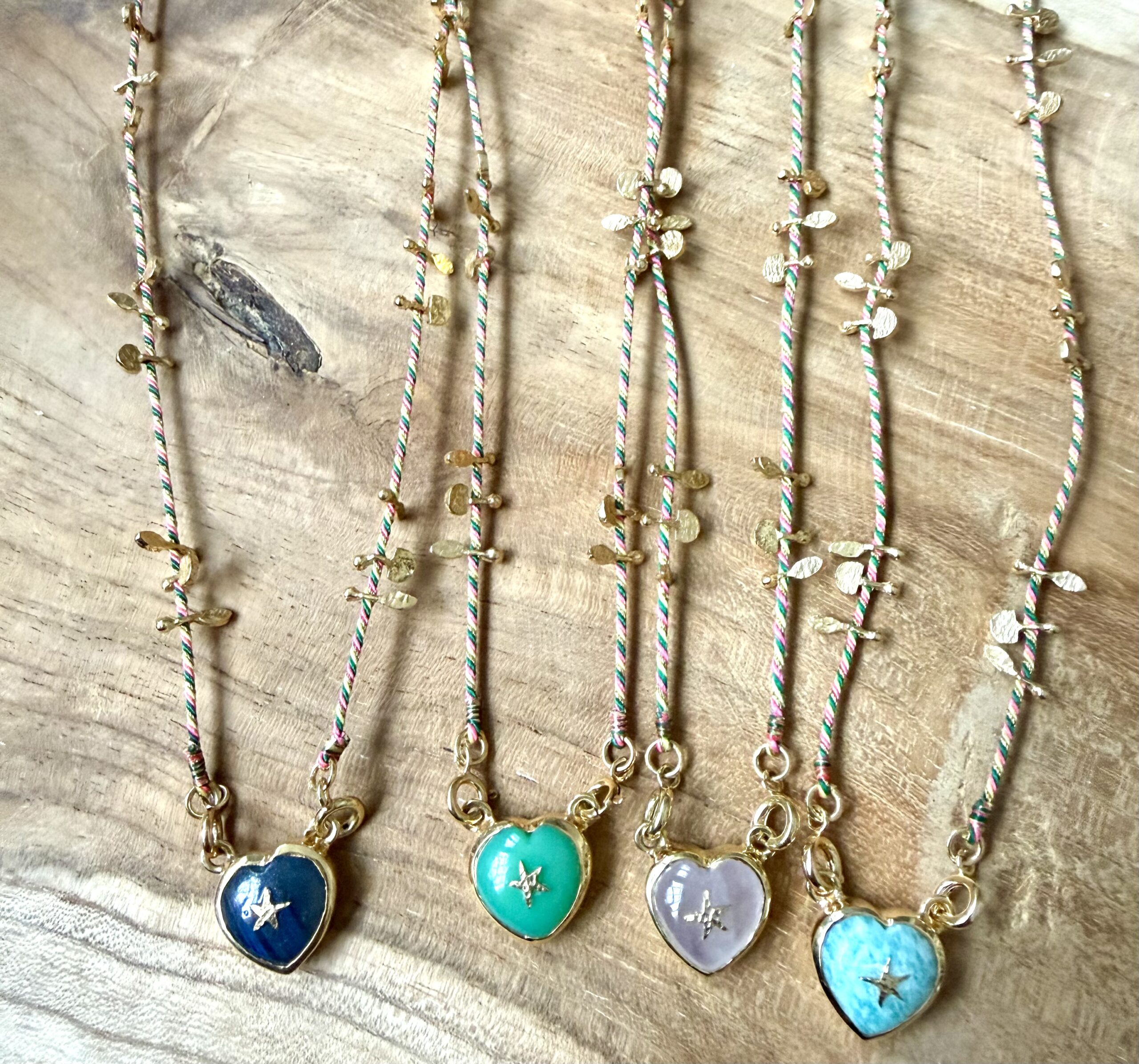 Collier choker en cordon avec ses multiples charms et pampilles en plaqué or et son joli coeur sertie en plaqué or et son étoile centrale sertie au centre . Existe dans 3 pierres différentes différents : Labradorite/Crysoprase/Amazonite. Longueur: 36 cm.