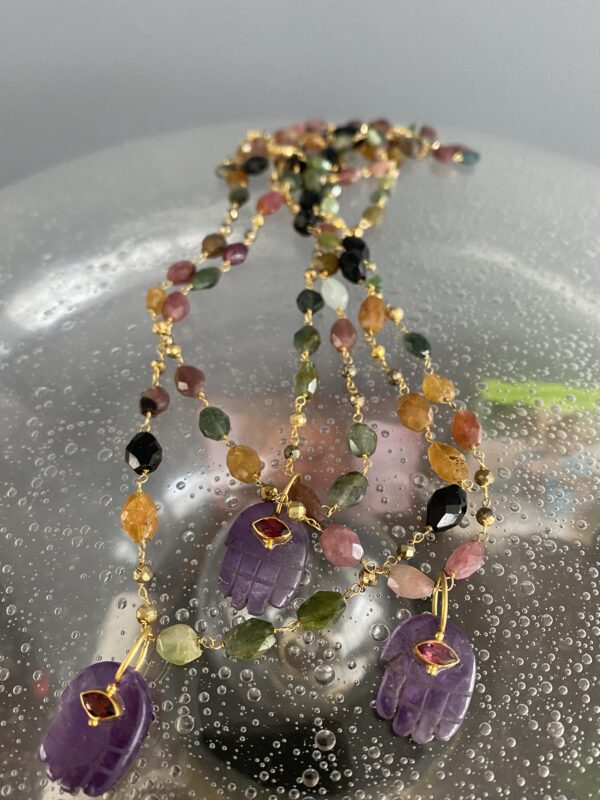 Collier en plaqué or et pierres semi-précieuses gravée en forme de main avec au centre son oeil porte-bonheur en grenat création d’inspiration orientale « la Khamsa », sur une chaine de pierres Tourmalines de différentes formes et irrégulières. Longueur du collier 45 cm.