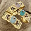 Manchette en plaqué or avec sa grande pierre centrale gravée en forme de main protectrice avec son oeil en grenat indien serti dessus, elle est entièrement gravée de petites porte-bonheurs , des étoiles et des coeurs tout autour mais aussi avec ses 3 pierres en grenat serties à chaque extrémités .