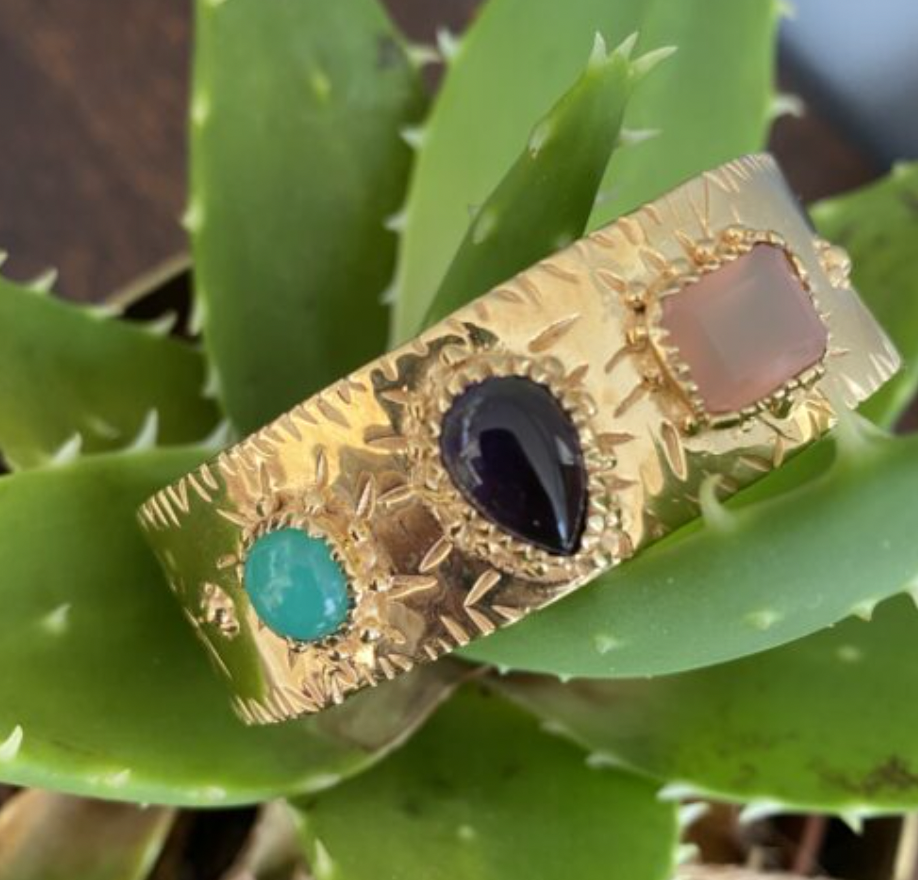 Manchette en plaqué or avec ses 3 pierres serties de différentes formes et ses pictos gravés tout autour forme d’étoile et de fleurs Pierres : Quartz Rose/ Améthyste/ Crysoprase.