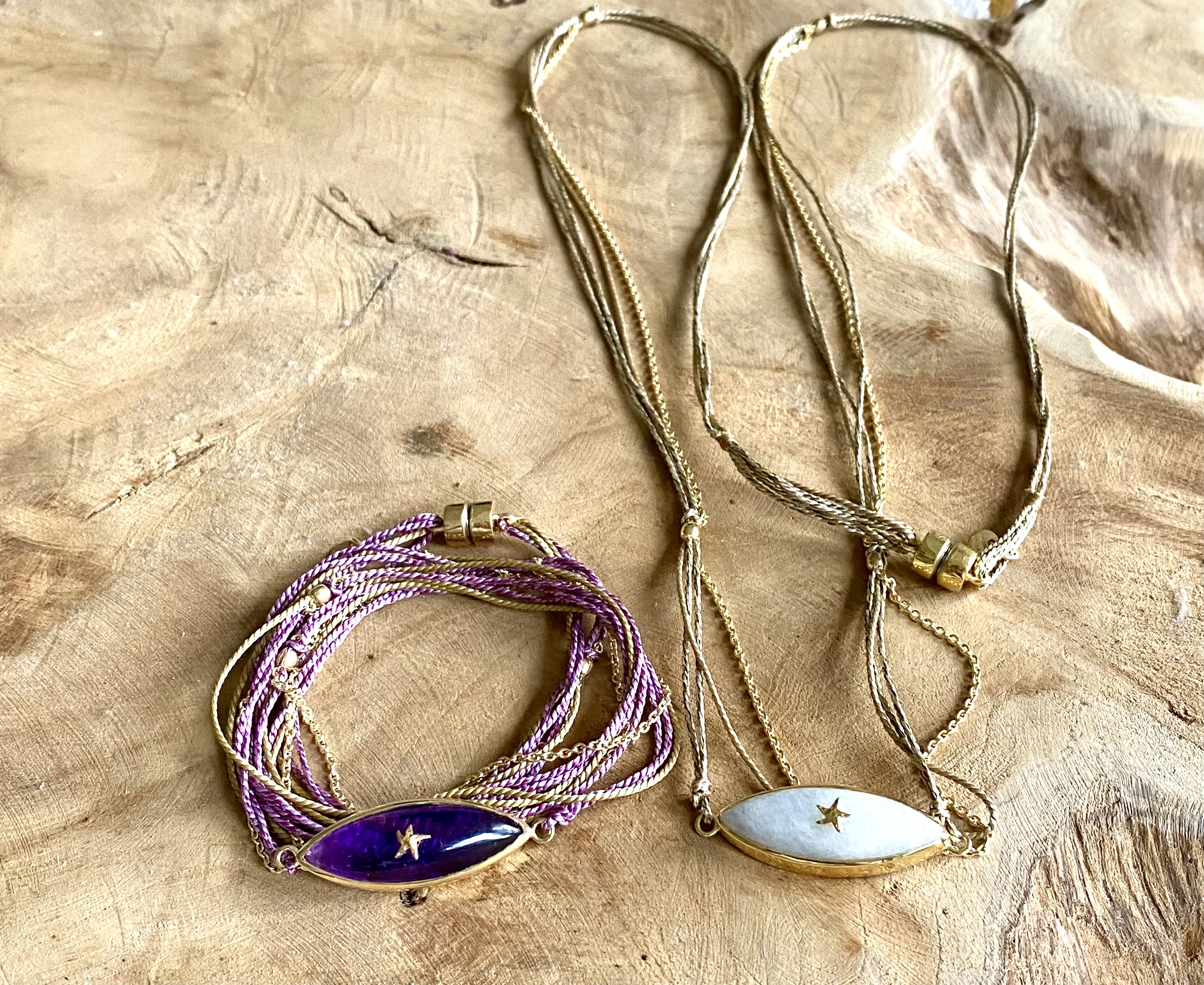 L’indispensable « tout en un » qui peut tout à tour se porter en sautoir puis en Bracelet Multi-tours puis en Collier double rang. Cordons et chaine gold et sa pierre en forme d’oeil sertie avec son étoile irrégulière au centre .