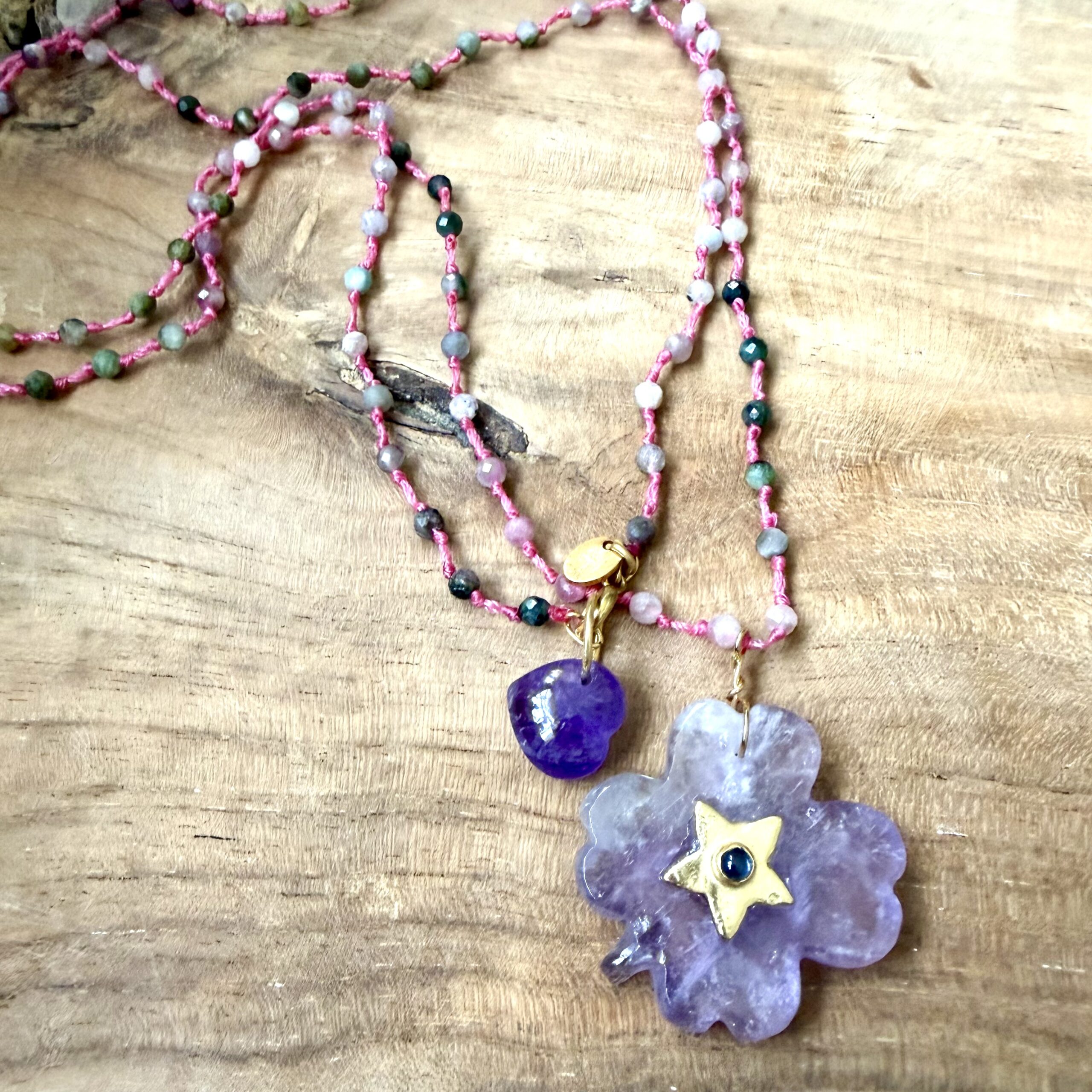 Sautoir tout en pierres semi précieuses sur cordon pierre avec son joli pendentif tréfle gravé et serti d’une étoile et pierre gravée au centre et son coeur en pierre gravée .Existe dans d’autres pierres semi-précieuses. Peut se porter en double collier et en bracelet multi tours . finition et fermoir en plaquer or .