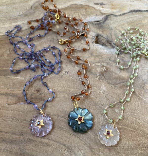 Sautoir tout en pierres semi précieuses sur cordon pierre avec son joli pendentif en pierre gravée en forme de Fleur porte-bonheur et sa pierre sertie au centre. Existe dans d’autres pierres semi-précieuses. Peut se porter a plusieurs longueurs et en bracelet multi tours . finition et fermoir en plaquer or .