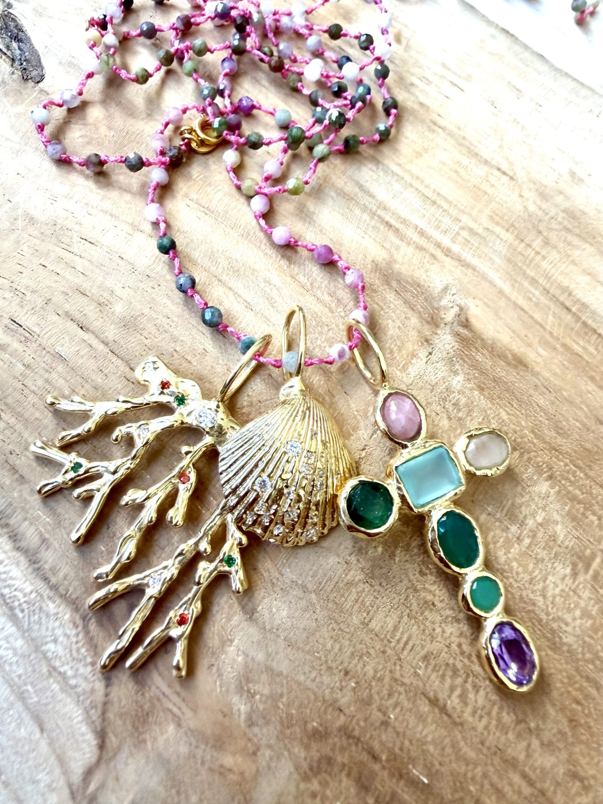 Sautoir tout en pierres semi précieuses multi Tourmalines sur cordon pierre avec ses 3 grands charms pendentifs : Corail / coquillage/ Croix en plaqué or et ses pierres semi-précieuses serties. Peut se porter a plusieurs longueurs et en bracelet multi tours . finition et fermoir en plaquer or .