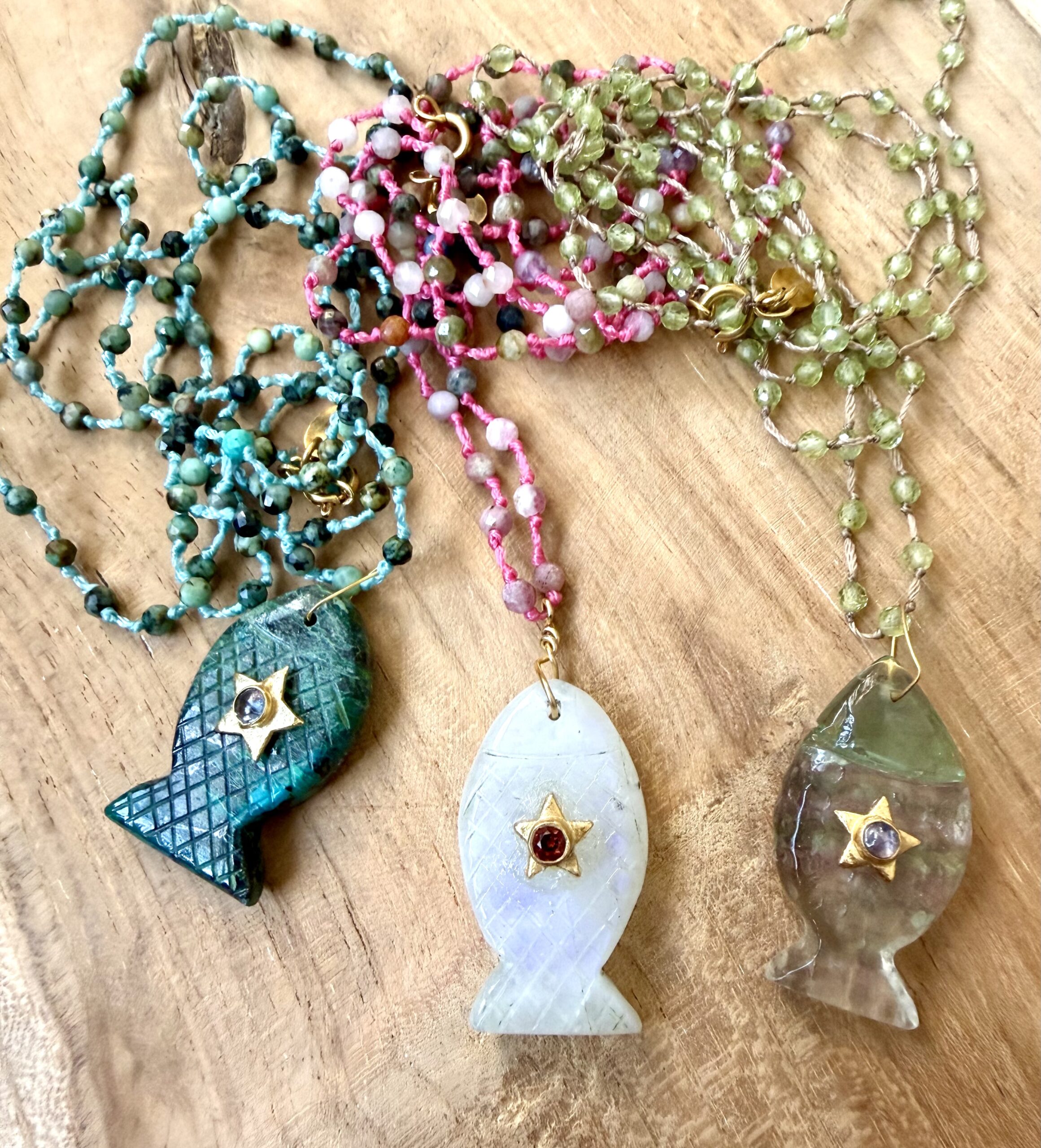 Sautoir tout en pierres semi précieuses sur cordon pierre avec son joli pendentif poisson en pierre gravée et sa pierre sertie au centre. Existe dans d’autres pierres semi-précieuses. Peut se porter a plusieurs longueurs et en bracelet multi tours . finition et fermoir en plaquer or .