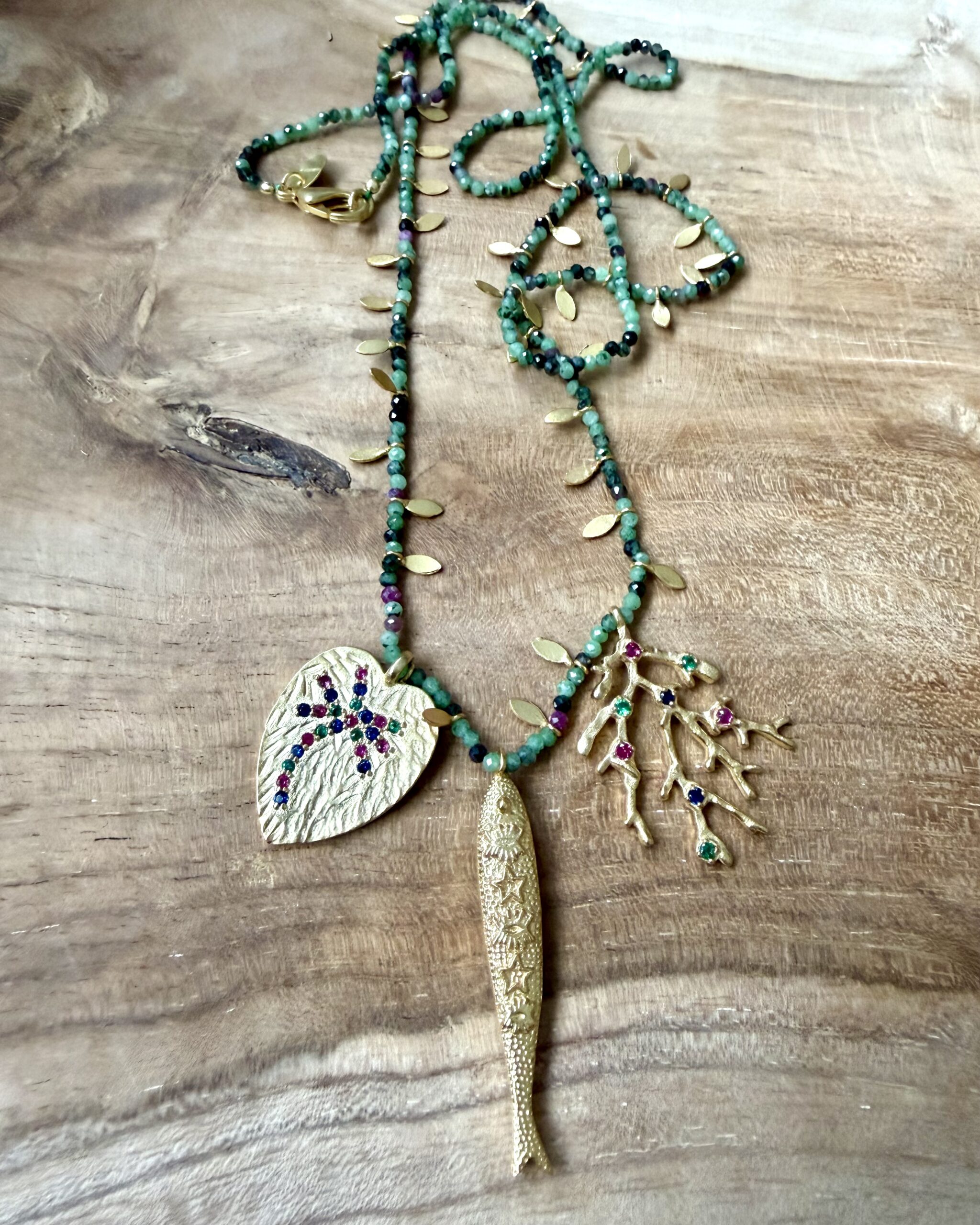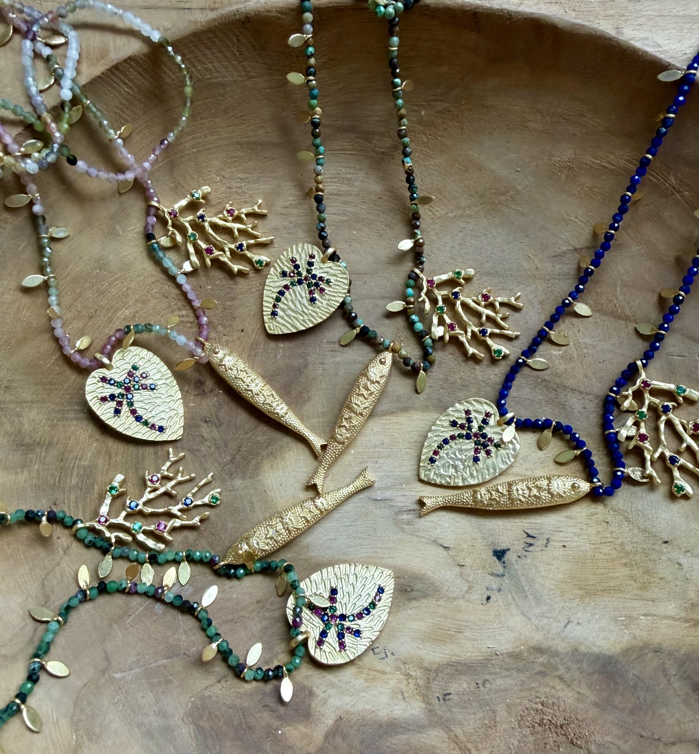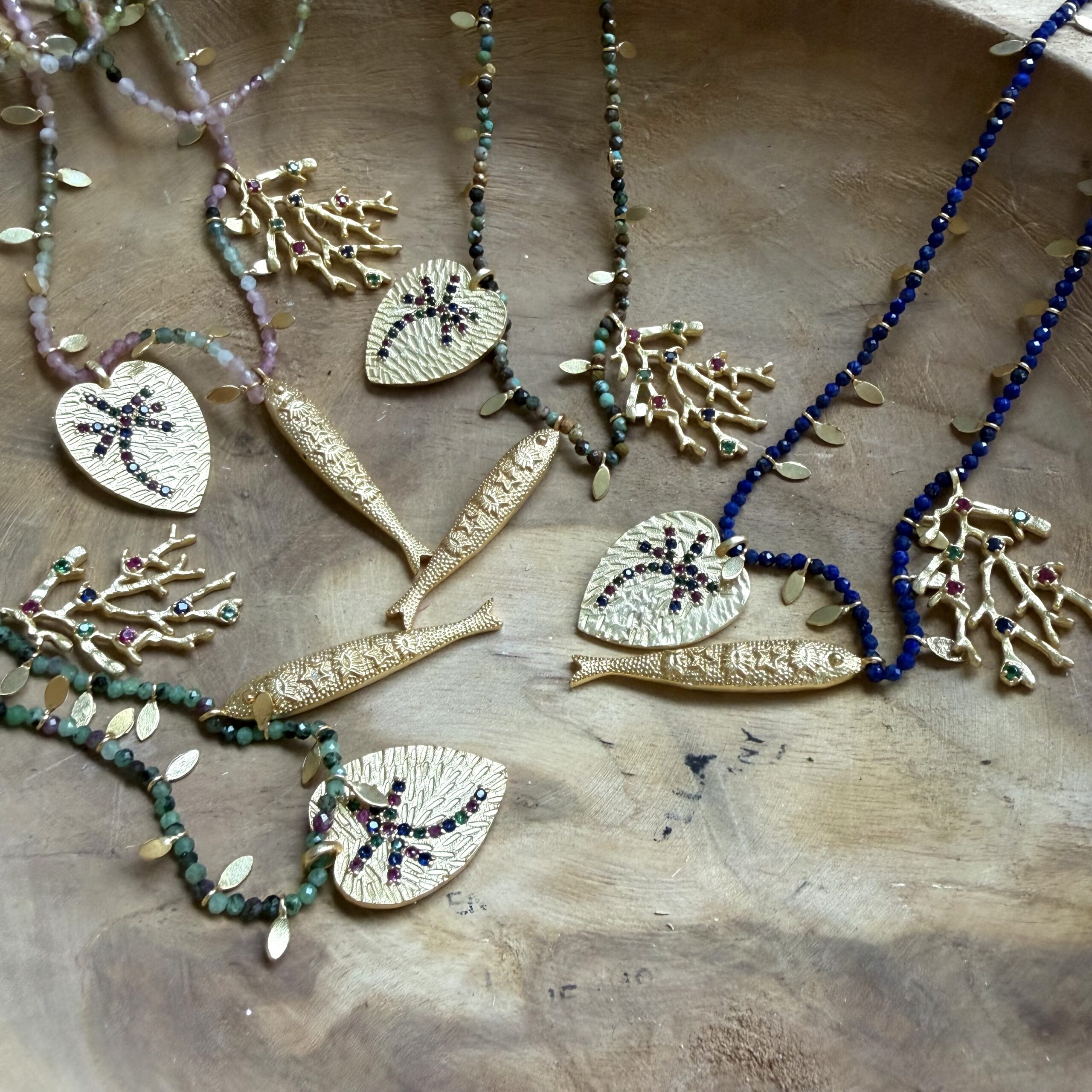 Long sautoir tout en pierres semi précieuses parsemé de ses 3 beaux pendentifs en plaqué or. Le poisson tout gravé de pictos portes bonheurs, sa médaille en forme de coeur avec son palmier en zircons de couleurs, et son rail tout sertis de pierres.