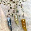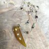 Long sautoir tout en pierres semi précieuses de styles, tailles et forme irrégulières (Multi pierres et Tourmalines …) sur cordon tressé gold avec quelques, pampilles en plaqué or, et au centre son pendentif corne et ses incrustations martellées. Reglable et ajustable peut se porter à plusieurs longueurs.