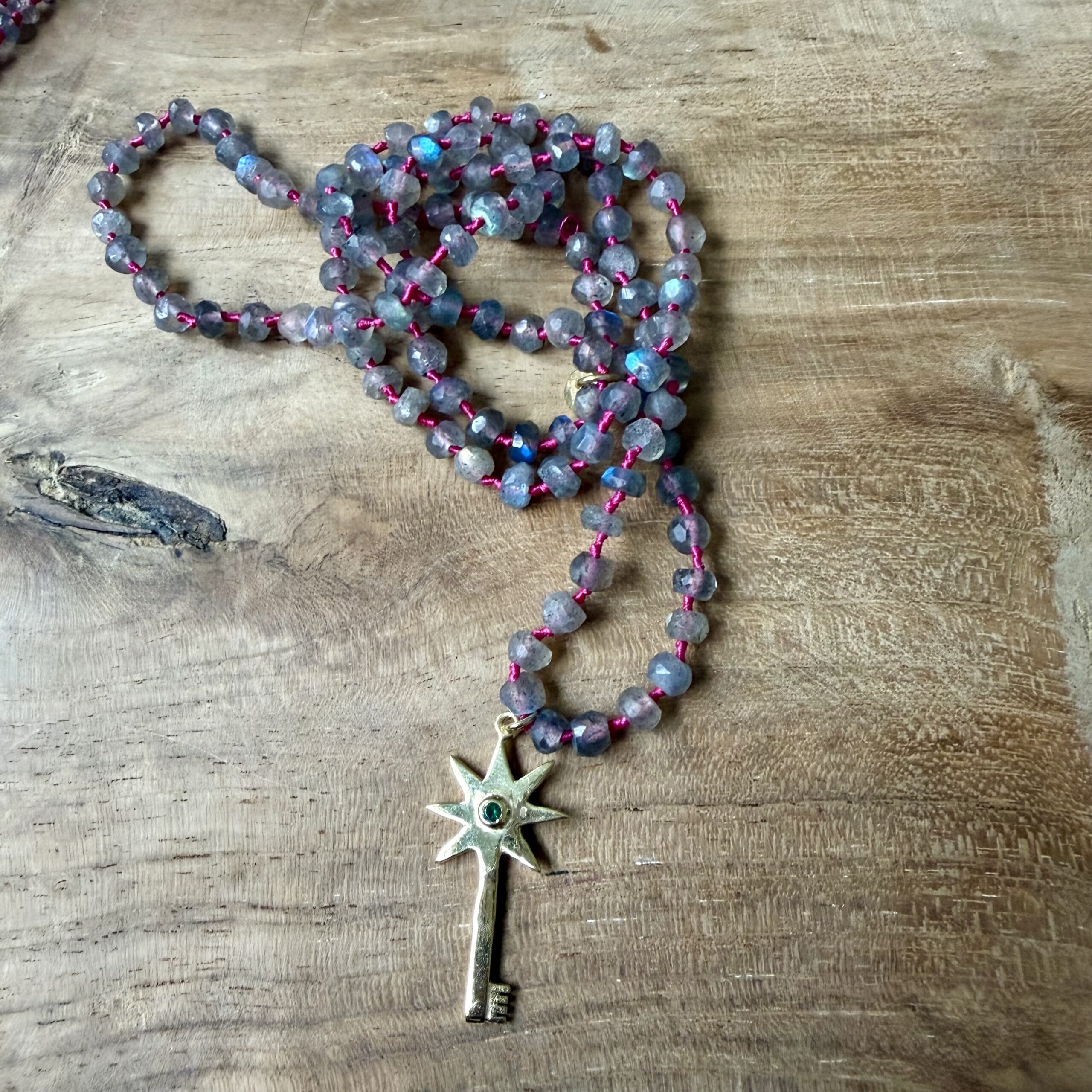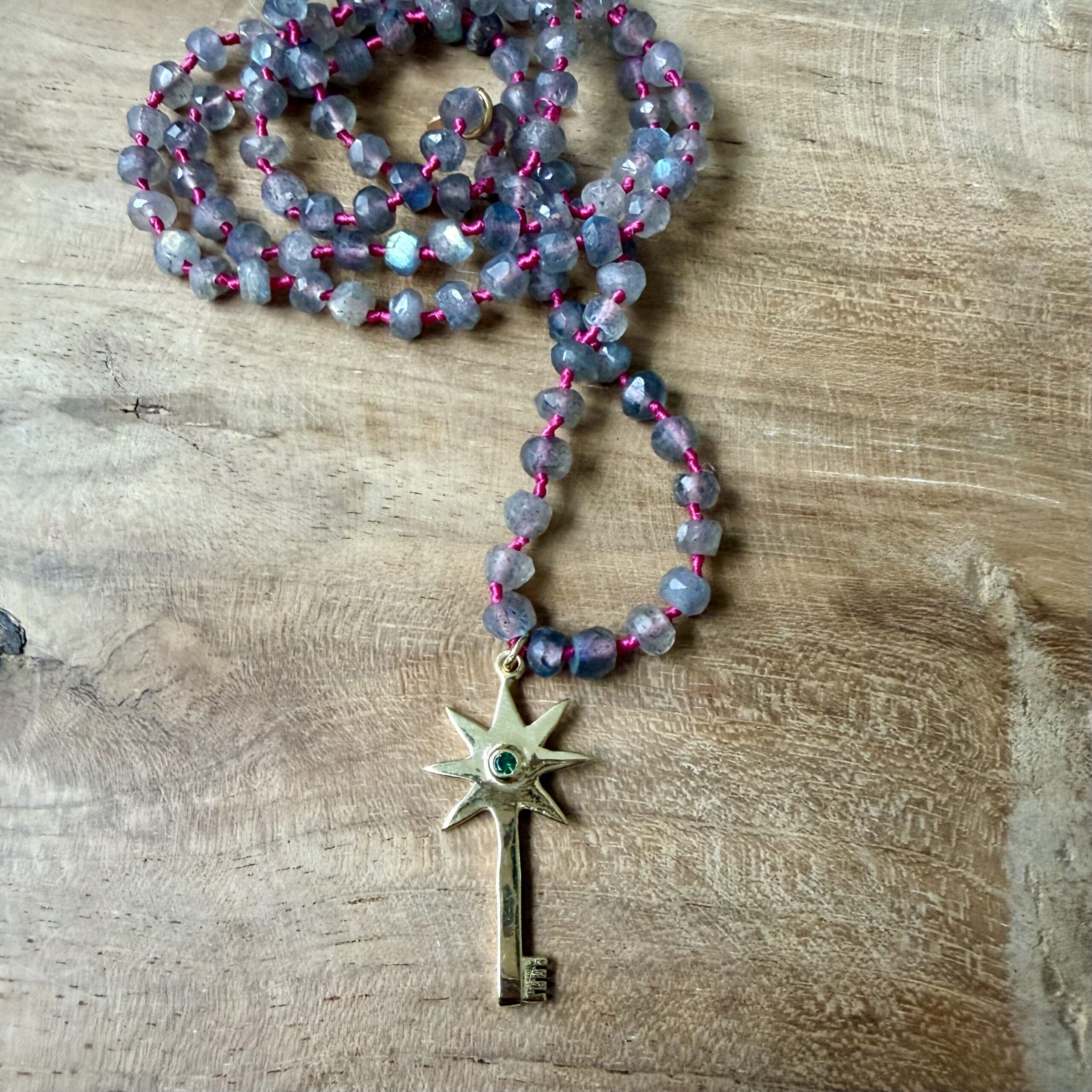 Sautoir tout en pierres semi-précieuse avec son joli pendentif clé  en plaqué or en forme d’étoile irrégulière gravé  et sa pierre onyx vert au centre  sur cordon rose éclatant inspiré de la ville rose de Jaipur .