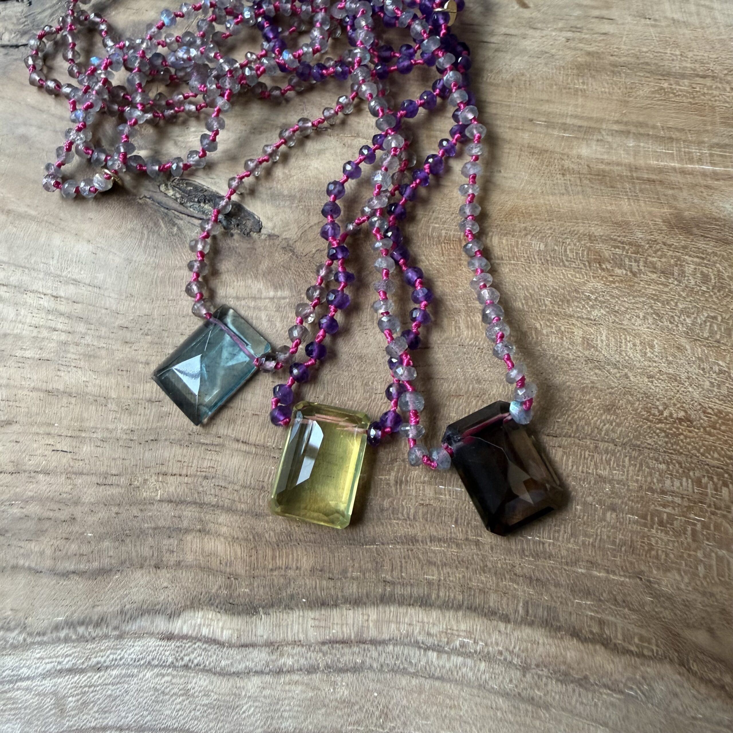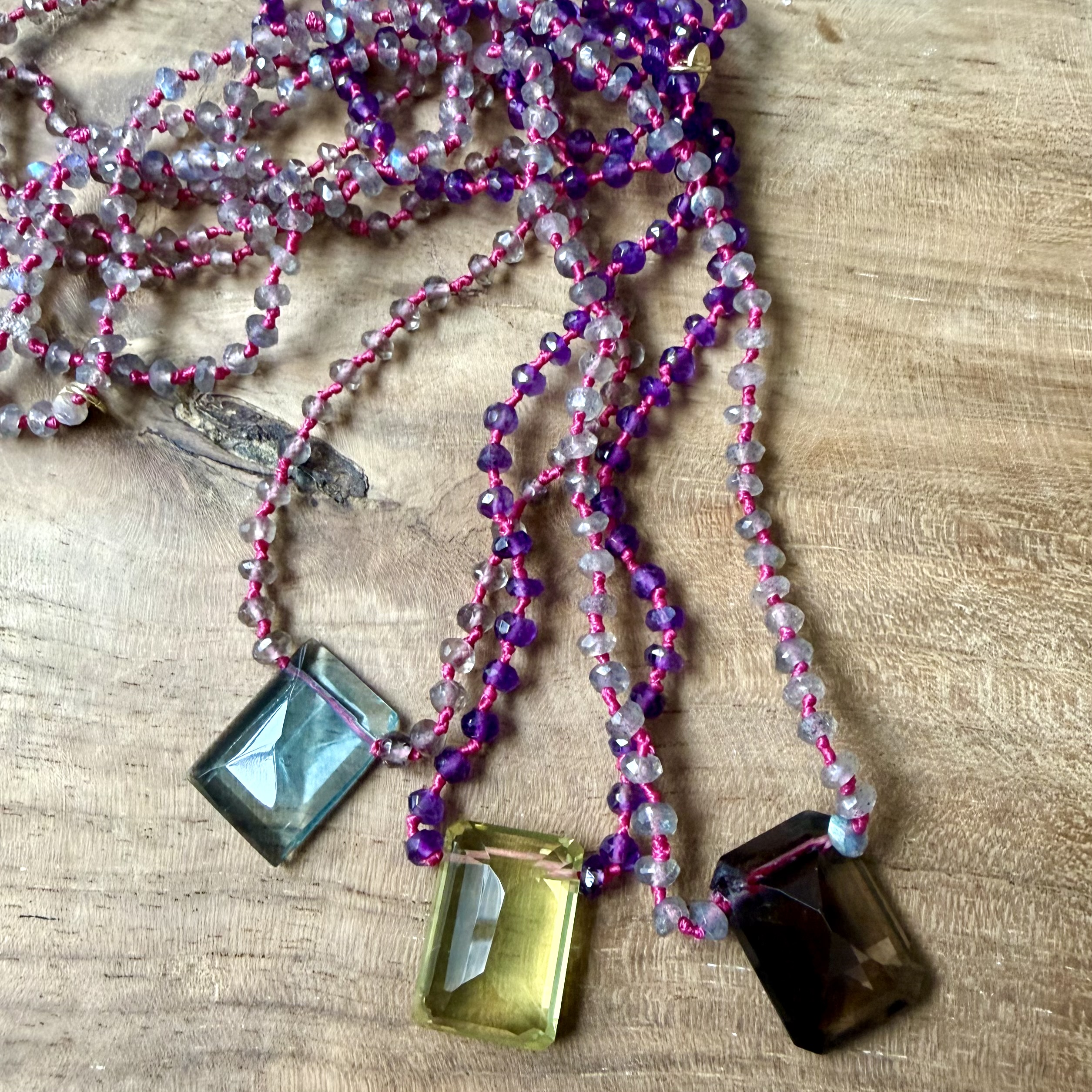 Sautoir tout en pierres semi-précieuse avec son joli pendentif pierre rectangulaire pure et délicate sur cordon rose éclatant inspiré de la ville rose de Jaipur . Ce sautoir c’est toute une histoire.